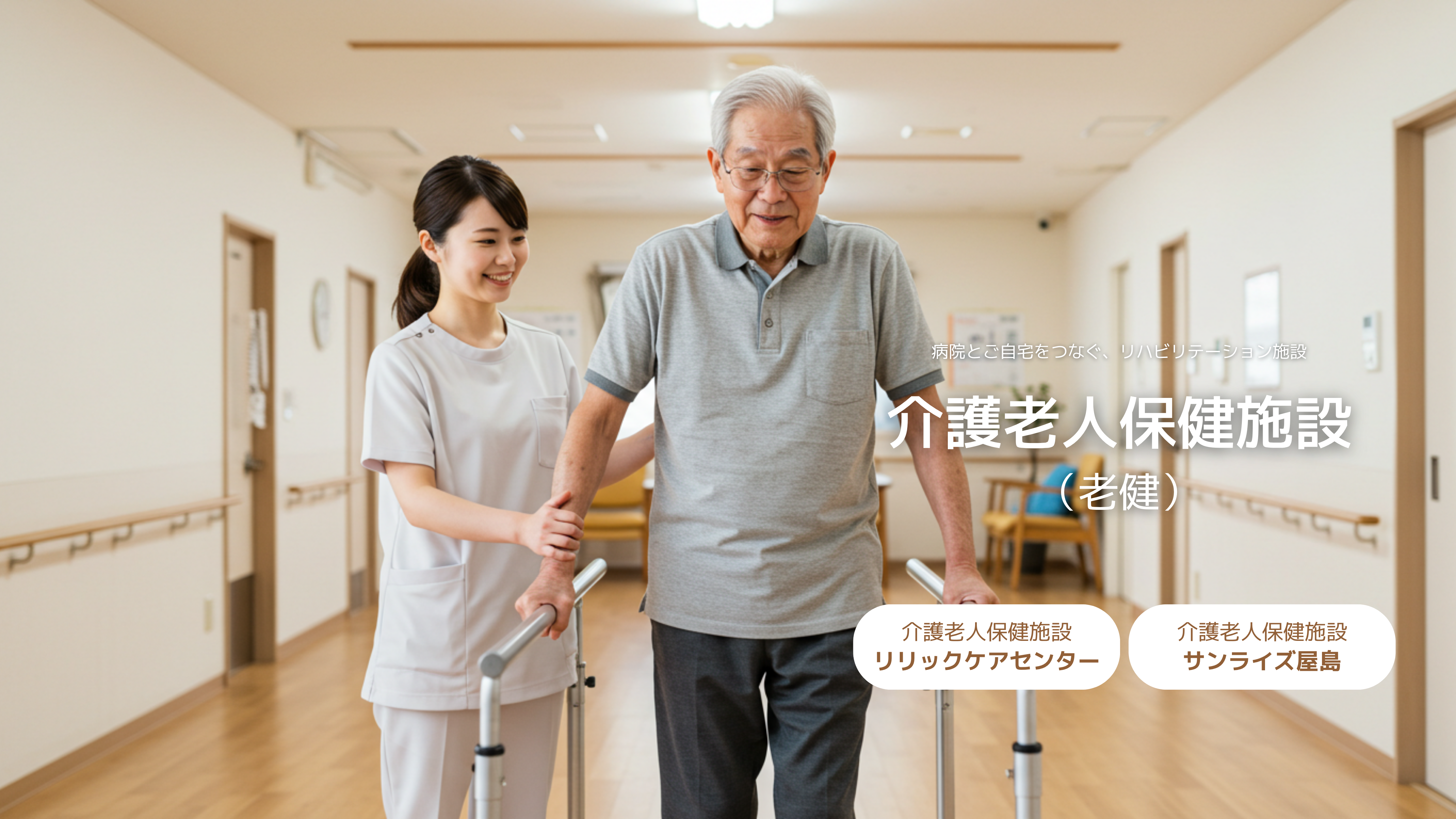 介護老人保健施設(略して「老健」とも呼ばれます)は、病院での治療を終えた高齢者の方などが、再びご自宅で安定した生活が送れるように、リハビリテーションを中心としたケアを行う施設です。